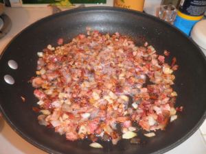Put a large pot of water on high heat for the pasta. Don’t forget to salt the water (at least a tablespoon. If you can’t taste the salt in the water, you haven’t added enough). While the water heats up, get your chopped bacon into a 12 inch frying pan on medium heat. Note: traditionally, this dish calls for pancetta, which I have used before (I can’t vouch for Zia Bruna’s–I didn’t even know what pancetta was in 1978). If I am planning this meal, I will buy thick-sliced or slab bacon; more often than not, though, I am making this dish spur of the moment and using whatever bacon I happen to have in the house). Let the bacon cook long enough for the fat to start to render, then add your chopped onion.