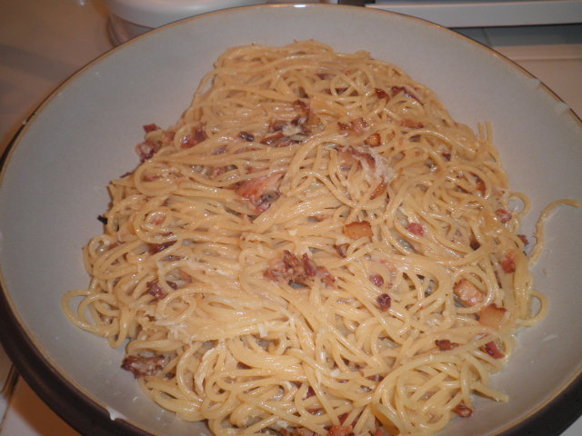 which will have started to set and cook onto the spaghetti. The goal here is not scrambled-eggs-and-spaghetti; you should end up with something closer to a cooked-enough-to-forget-about-salmonella-but-wet-enough-to-call-a-sauce mixture.