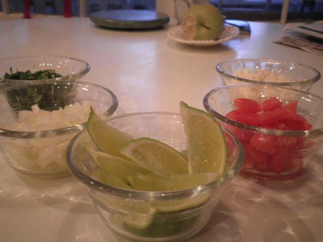 Place each of the fixings into its own bowl or container and bring it to the table. Now you’re ready to get started on the tortillas and the meat.
