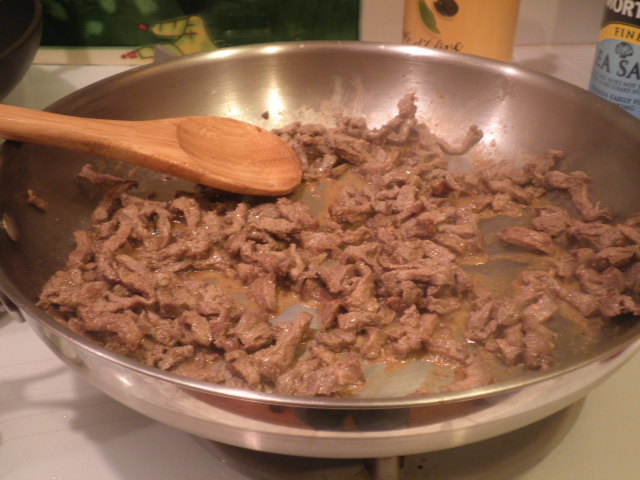 - 3/4 lb leftover steak, cut into thin, bite-size morsels