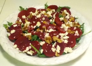 Create a bed of arugula on a serving plate, then arrange the slices of beets in a single layer. I have used both pickled and plain beets for this salad, and we like it equally well both ways. If you are using fresh beets, boil them in their skins until tender; cool, peel, and slice. Sprinkle crushed walnuts and feta cheese evenly.