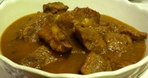 Heat your oil to medium-high in a heavy-bottomed pot (I estimated the oil–you want to have about 1/8″ across the bottom of your pot ). Combine 1 tablespoon of the salt, the black pepper, the cinnamon, and the flour. Dredge your beef cubes and brown on all sides in small batches. Set aside the beef.