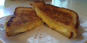 Melt a pat of butter (about a tablespoon) in a 10″ frying pan. Place one piece of bread in the melted butter for a couple of seconds, allowing the butter to soak in. Remove this piece of bread and replace it with the second piece of bread–move it around in the pan to make sure this second piece is equally drenched (yes, drenched) in butter. Toss the shredded cheese in a bowl until it is well mixed. Place all of the cheese (yes, all of it) on the bread. Cover the cheese with the second piece of bread, butter side up.
