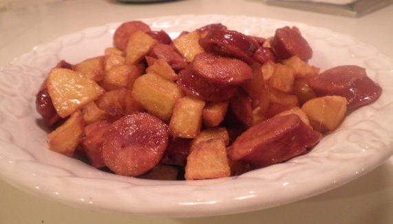 At that point toss the potatoes into the frying pan with the linguica. Kill the heat, and combine the linguica and potatoes. Serve piping hot.