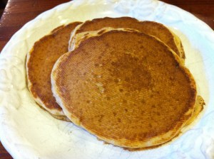 I do pancakes one of two ways–either using a small cast iron griddle that was once owned by Josh’s great-grandmother, or using an enormous, 16″ frying pan. The cast iron griddle gives a really nice finish, but sometimes cooking four pancakes at a time has its distinct advantages.