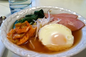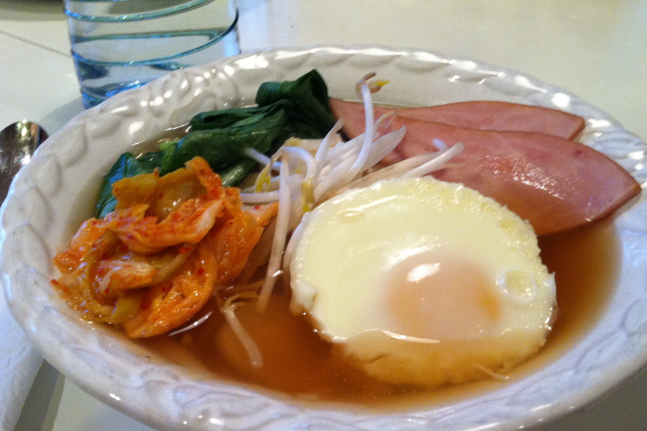 Laying out the soup is about as much fun as eating it. Portion your noodles in each bowl. Remove the greens and the ham slices from the soup and set aside for a moment. Ladle in the soup, making sure to get some diakon and tofu in each bowl. Next, cut the large ham pieces in half, placing two slices in each bowl, to one side. Add a portion of greens, then one egg, some kim chee, and a pinch of bean sprouts.