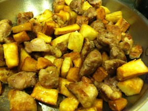 Whisk the miso into 1/2 cup of warm water, then add it, the soy sauce, the diakon, and the remaining 7-1/2 cups water to a soup pot. Bring to just under a boil and reduce to a simmer. Add the tofu cubes and the four slices of ham. You should start a separate pot of water to boil for your noodles around now as well.