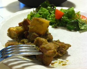 Poach your eggs in the egg-poaching vehicle of your choice. I use small, glass ramekins in a boiling water bath, but use whatever you like, as long as your finished product is a nice, round disk of egg. You will want to poach your eggs hard. While they are cooking add the choy sum to the soup–whole leaves, but with stems removed. Continue to simmer.