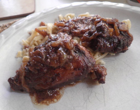 Transfer the liquid and the cooked onions to the casserole dish. Cover and cook in the oven for an hour and a half. Serve over dumpling noodles or spaetzle.